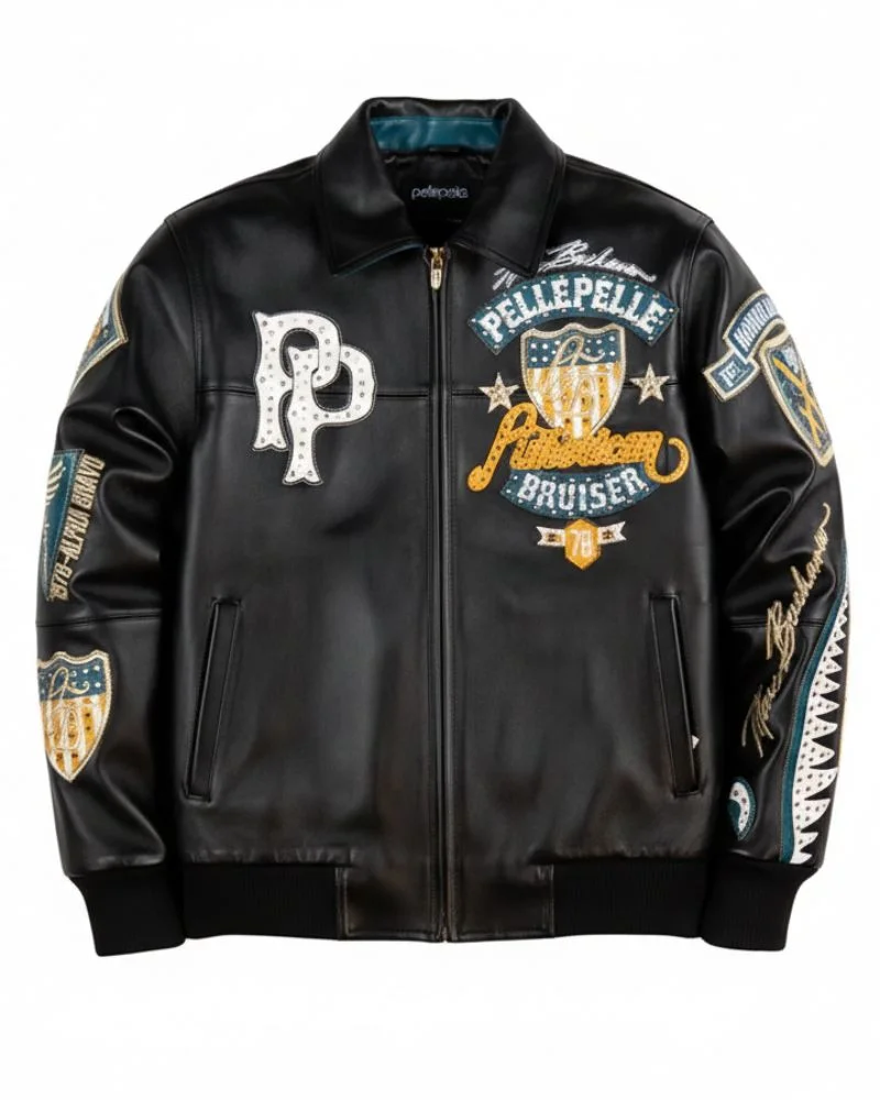 The jacket features custom Pelle Pelle branded hardware, including a heavy-duty front zipper pull that adds both strength and authenticity. What truly sets this piece apart is its detailed branding and artistic craftsmanship. The left chest showcases hand-applied self-leather double “P” logos enhanced with metallic stud hardware, while the right chest proudly displays the American Bruiser shield with bold outline direct embroidery.