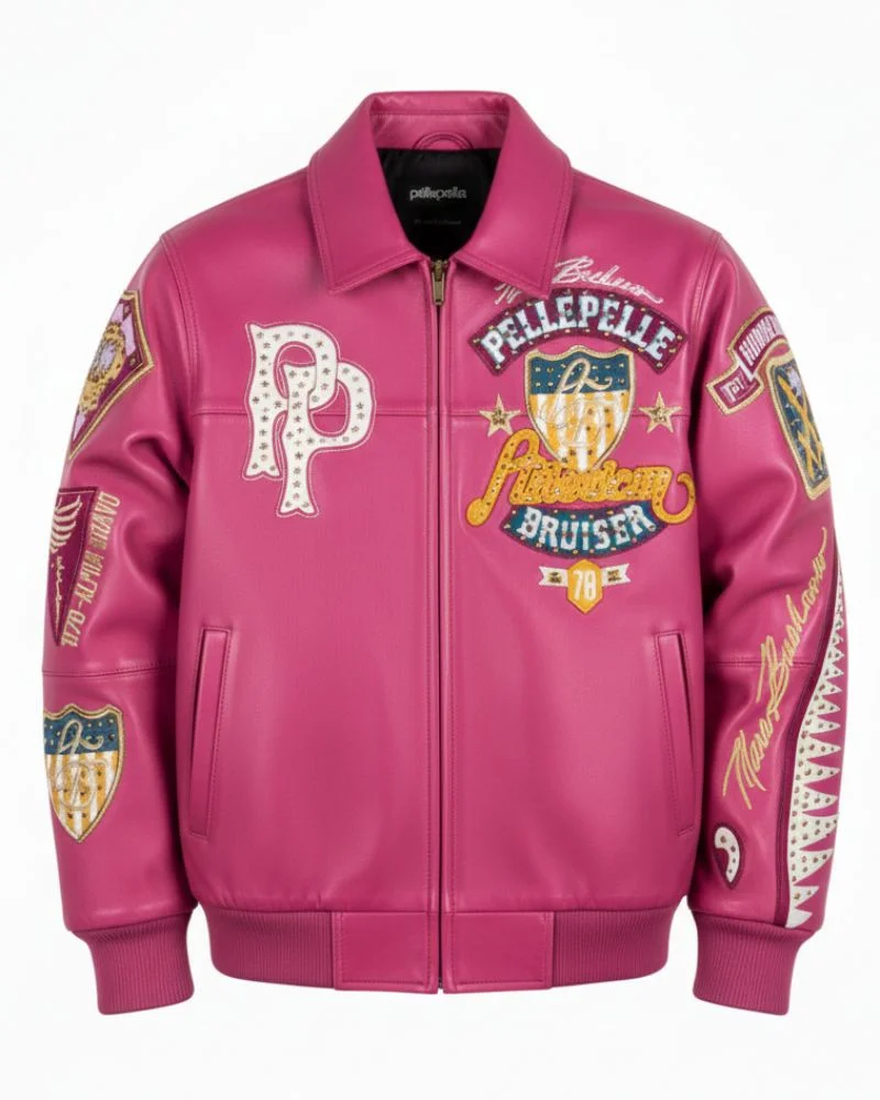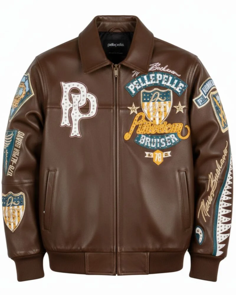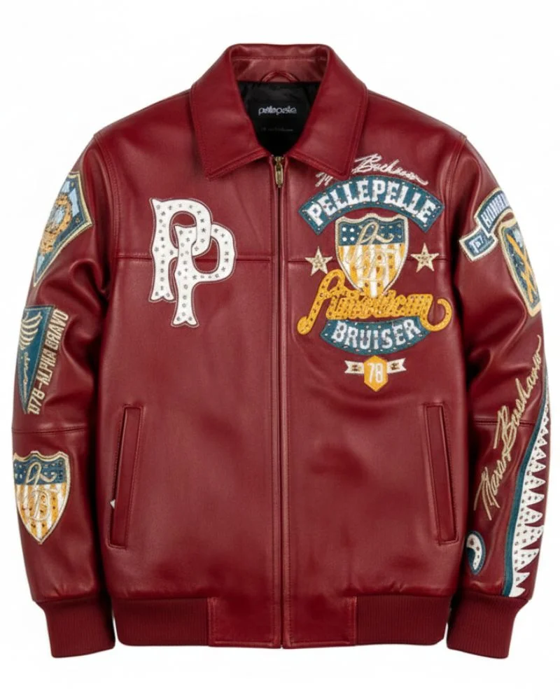 The sleeves elevate the design even further the right sleeve features contrast color leather striping for a varsity-inspired look, while the left sleeve is finished with multi-layer embroidery and signature Pelle Pelle branding. Completed with a traditional turn-down leather collar, this jacket delivers timeless style with modern attitude.