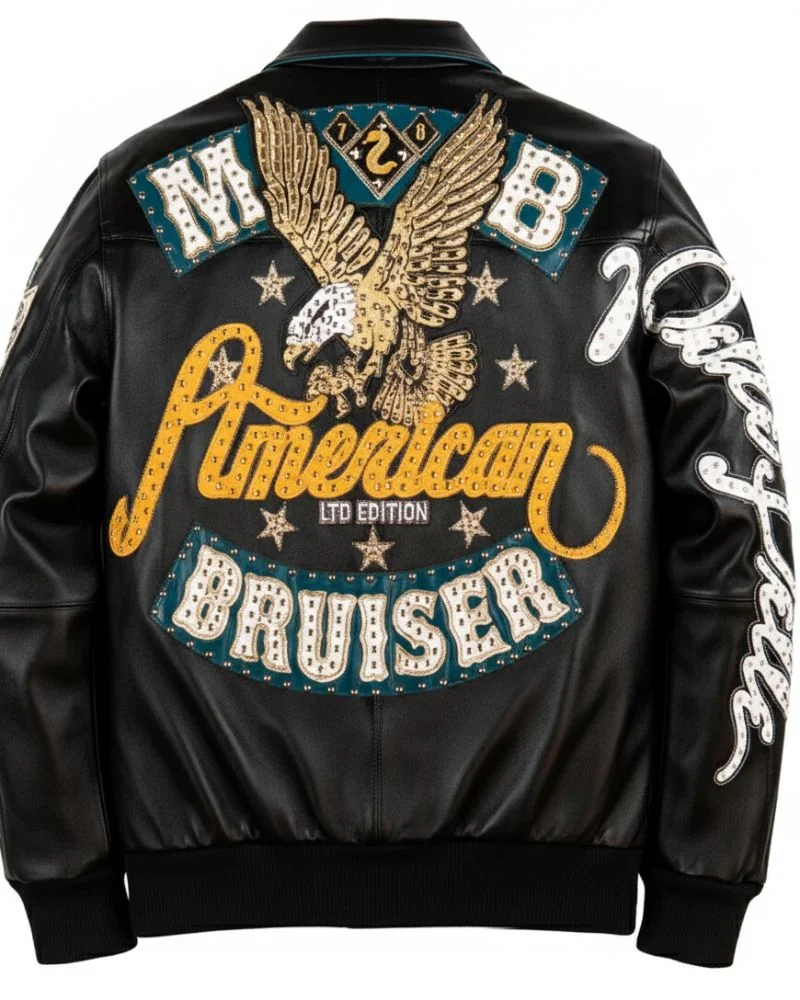 The jacket features custom Pelle Pelle branded hardware, including a heavy-duty front zipper pull that adds both strength and authenticity. What truly sets this piece apart is its detailed branding and artistic craftsmanship. The left chest showcases hand-applied self-leather double “P” logos enhanced with metallic stud hardware, while the right chest proudly displays the American Bruiser shield with bold outline direct embroidery.