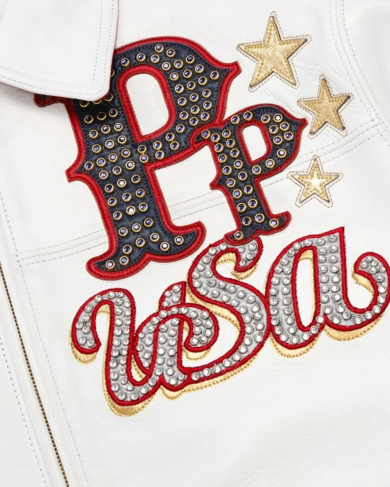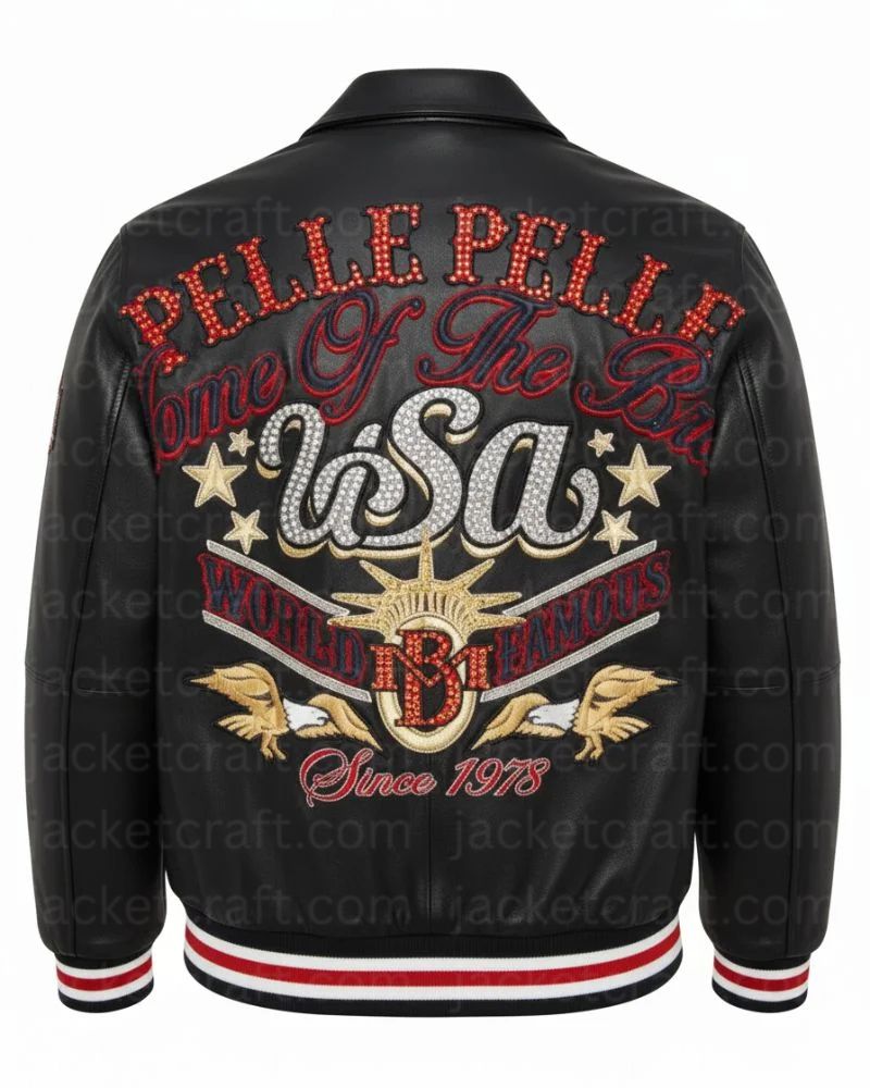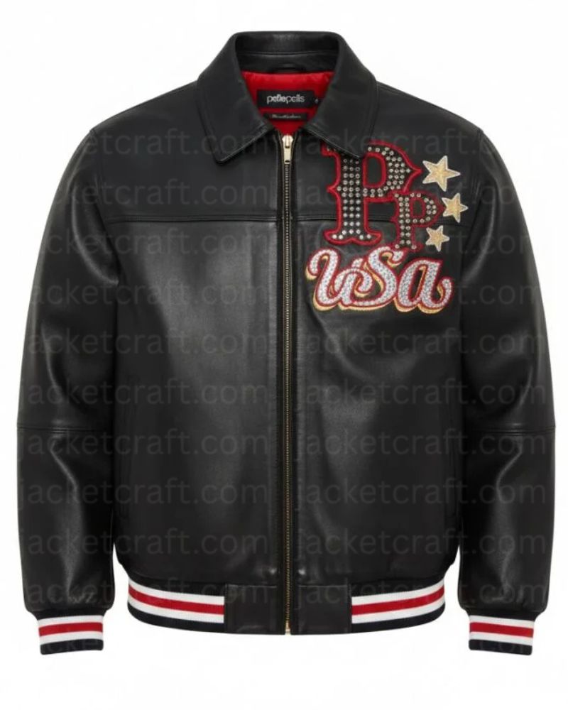 Celebrate bold American heritage with the Pelle Pelle Stars & Stripes USA Emblem Leather Jacket. This design speaks to people who value premium streetwear with meaning. Also it combines old school patriotism with modern luxury which in turn gives you a strong yet stylish look. The PP USA emblem on the chest is what catches the eye with its rhinestones, metallic leather, and navy accents.. As a result, these details create a clear and confident tribute to American pride without feeling overdone.