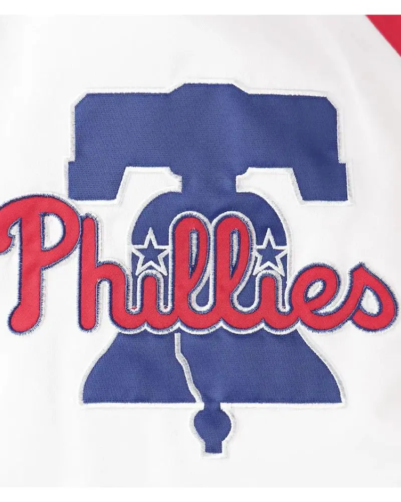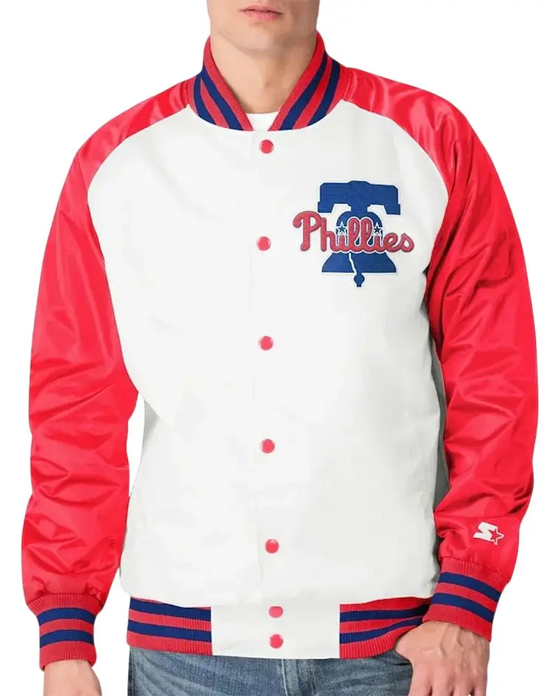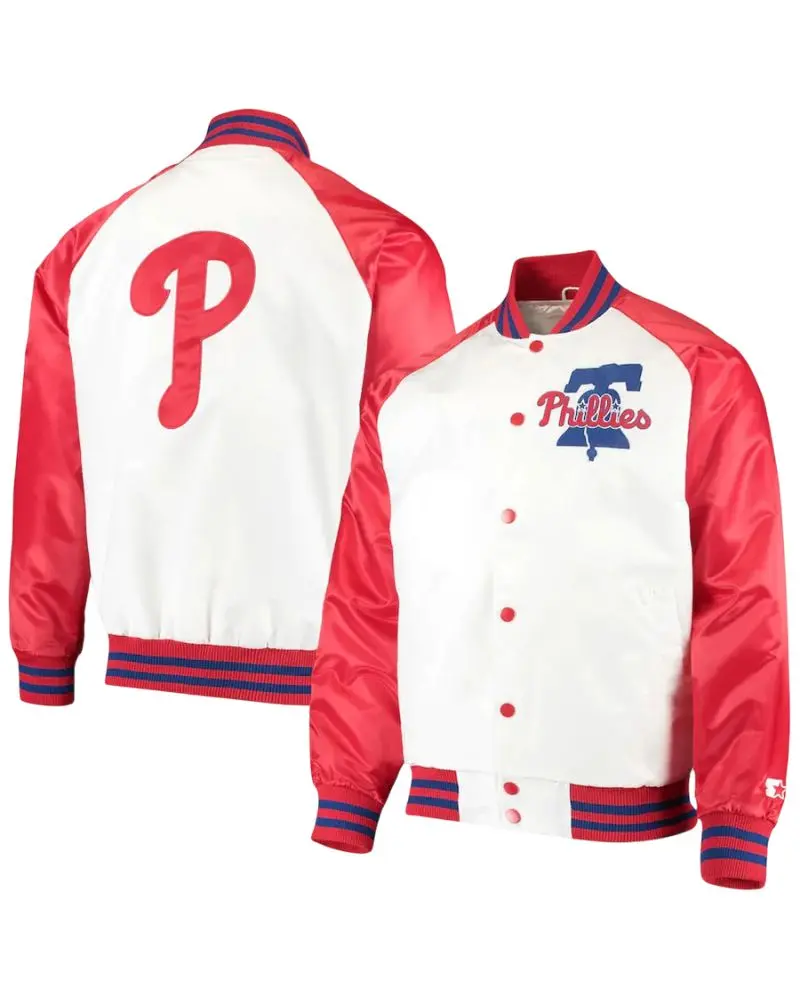 The Philadelphia Phillies’ number four hitter’s jacket in White/Red Satin is a sporty fashion accessory. This piece is inspired by the great American baseball team the Philadelphia Phillies. Thus it provides a very modern and sporty look. It is great for Phillies fans, for casual wear, and for street style.
