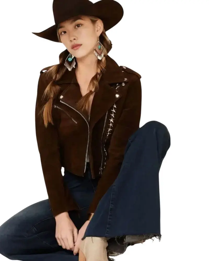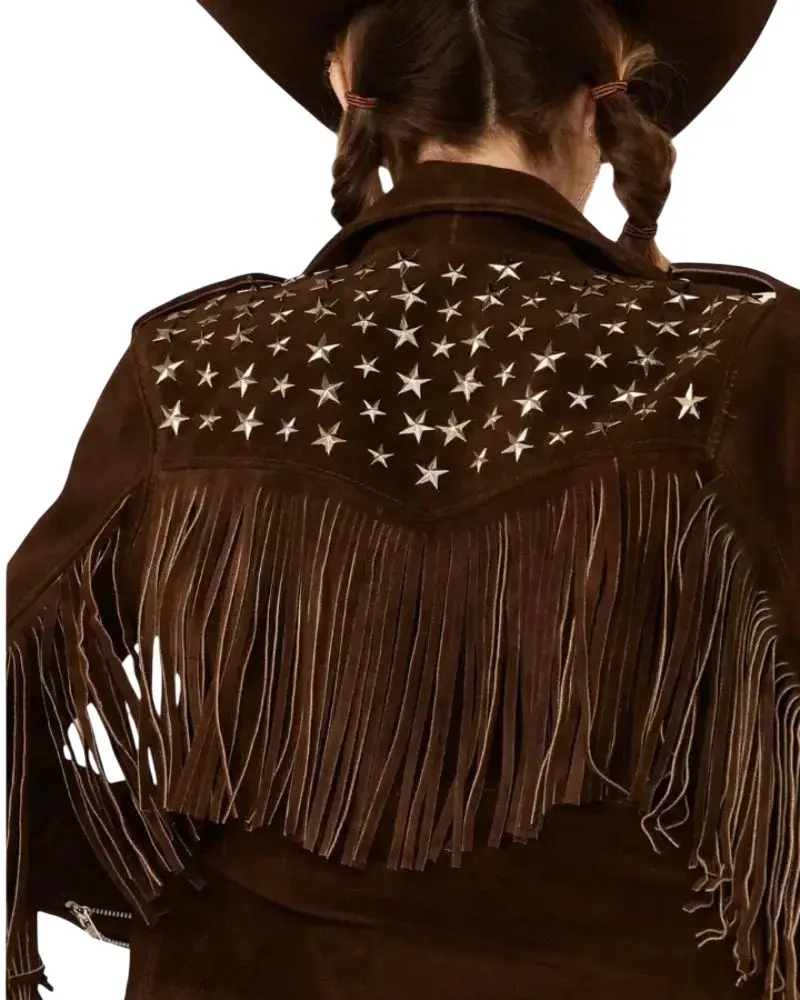 Women Brown Suede Fringe Studded Leather Jacket